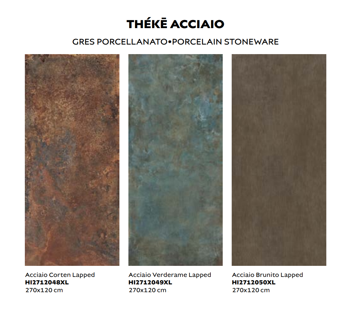 Theke Acciaio – gresie portelanata rectificata (3 culori) cu grosimea de 6 mm.
