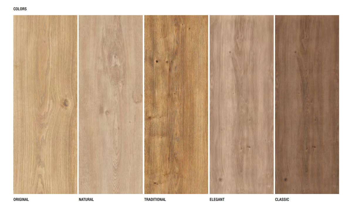 Colectia KOMI, gresie portelanata asemanatoare cu lemnul (5 culori), cu grosimi de 6 mm.